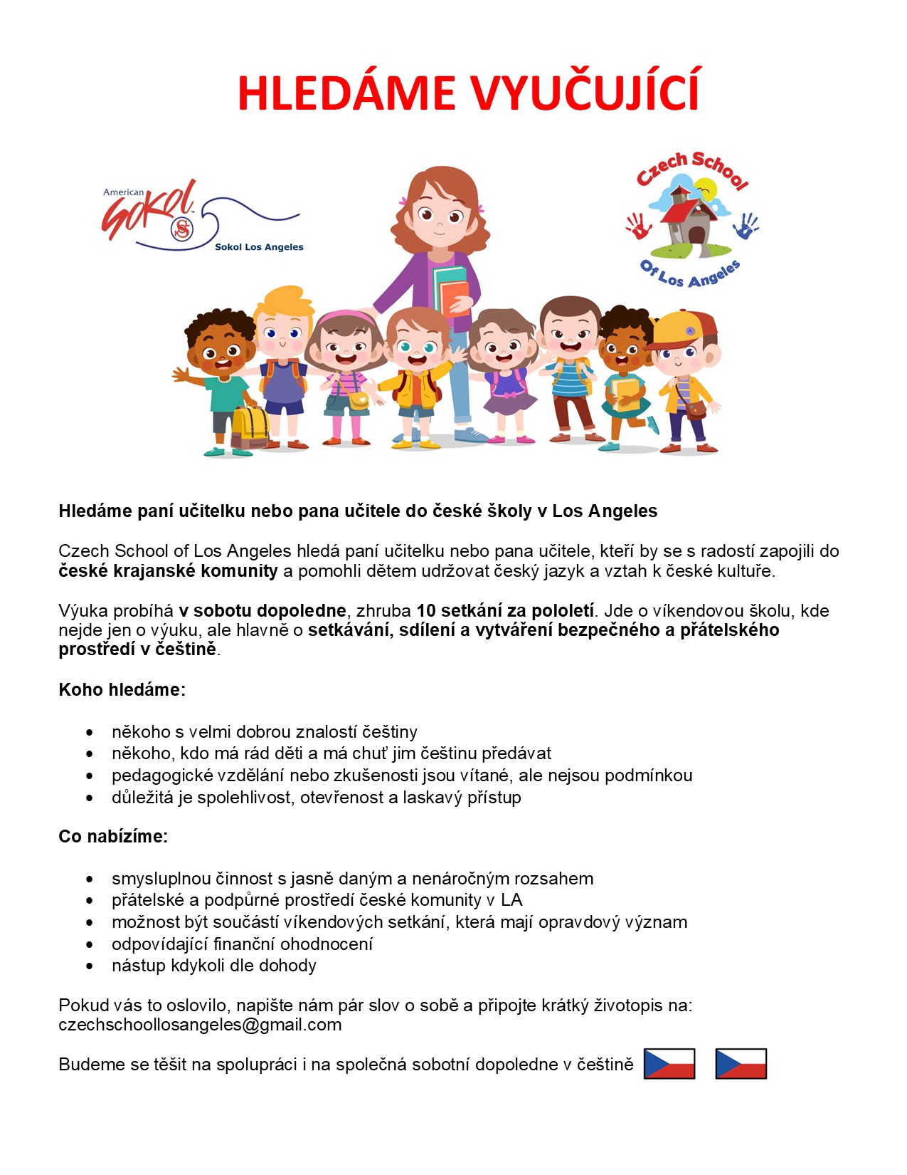 The Czech School of Los Angeles offers Czech language instruction for children aged 3 and up, as well as for youth and adults in the Los Angeles area and surrounding communities. The school was founded in 2010 by the Consul General of the Czech Republic in Los Angeles and was later taken over by a group of Czech parents who now manage the school and organize Czech cultural events, currently under the patronage of the American Sokol in Los Angeles.